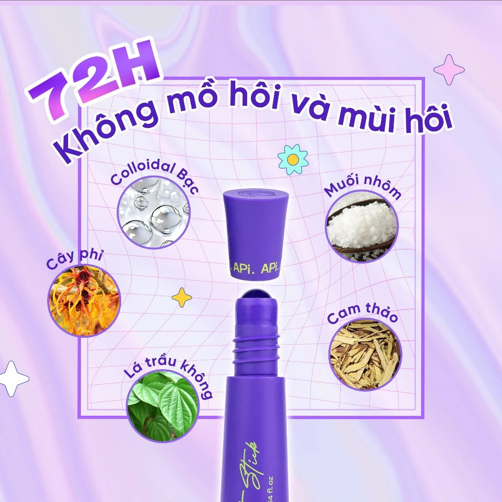 Son nách APi Tím giúp tiêu diệt vi khuẩn gây mùi hiệu quả nhờ công nghệ kháng khuẩn tiên tiến, bảo vệ vùng da dưới cánh tay sạch sẽ và thơm mát cả ngày dài.